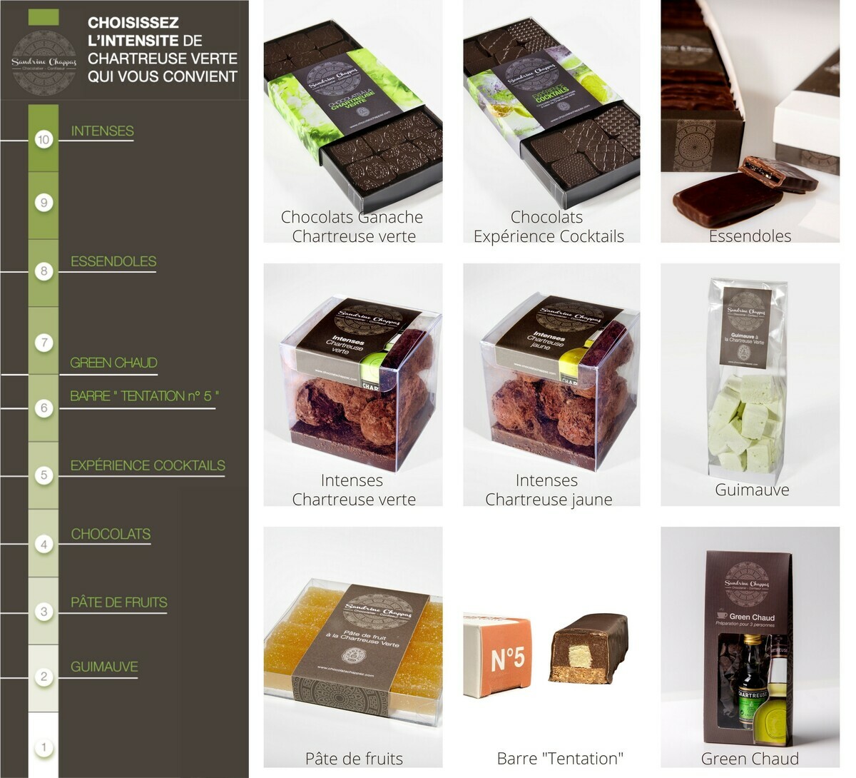 Cette technicité en fait un challenge passionnant pour des résultats à l’intensité différente selon le produit mis au point. De la plus légère, dans notre Guimauve à la Chartreuse verte, à l’intensité la plus forte avec nos Intenses à la Chartreuse verte ou jaune, vous aurez également une force intermédiaire avec nos chocolats ou encore, avec nos Essendoles.