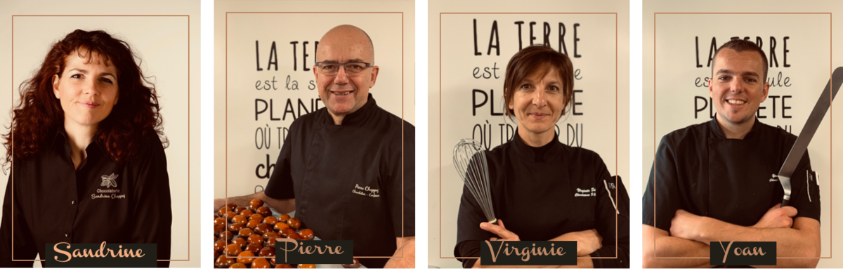 Chez nous, pas de Umpa Lumpa, pas de marmotte pour plier le chocolat dans le papier alu (pas de papier alu non plus d'ailleurs !). Juste une équipe motivée, dynamique et professionnelle pour vous confectionner les meilleurs produits dans la pure tradition artisanale. Ce sont leurs sourires et leur savoir-faire qui vous accueillent à chacune de vos visites dans notre Chocolaterie.