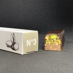 Barre gourmande composée d'un biscuit praliné noisettes du Piémont et d'un mélange croquant de fruits secs : noisettes du Piémont, pistaches de Bronte en Sicile, noix de Cajou, cranberries.